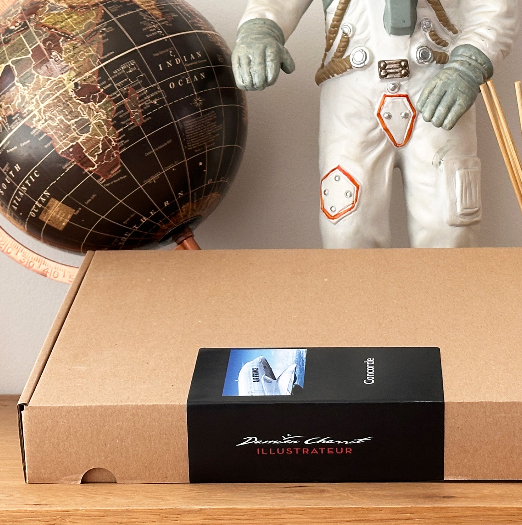 Retirage de dessin d’un avion légendaire présenté en petit cadre noir à poser ou à fixer.